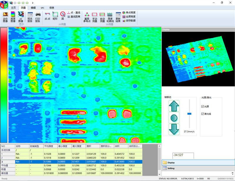商品名称: 3D锡膏厚度测试仪 商品编号: 3D SPI 6500 一、产品功能 1、友好的编程界面。 2、多种测量方式 3、扫描间距可调 4、形象的3D模拟功能 5、独立的3D动态观察器 6、强大的SPC功能 7、可测量丝印及铜皮厚度二、产品特色 1.采用原装德国进口高清彩色相机,保证测试的高精度和高稳定性。 2.采用军用级别的二级激光,受外界环境光源干扰小,更加稳定寿命更长。 3.采用灵活的硬件设计,光源、激光和相机,可对不同颜色的PCB板进行测试。 4.软件分析条件基于数据库,根据分析条件实现预警功能,直观易懂。 5.强大的报表分析功能,自动生成R-Chart,X-Ba